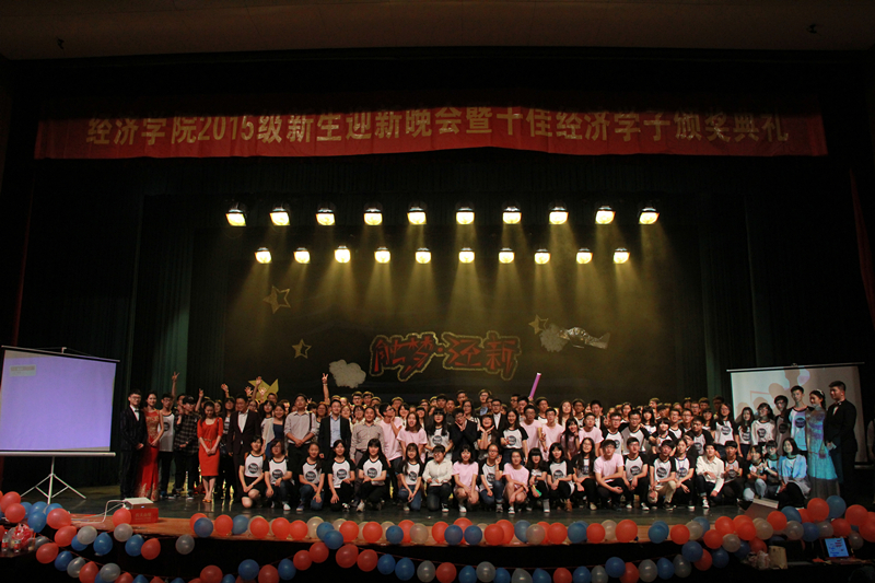 2015年10月25日晚18:30,浙江工商大学“经济学院2015级迎新晚会暨第五届十佳经济学子颁奖典礼”于我校剧院隆重举行。经济学院院长何大安老师,浙江新通留学有限公司总经理胡嘉西先生,学院党委副书记罗德明老师,学院院长助理、经济系主任王永齐老师,校团委副书记郑晓春老师,浙江新通留学有限公司卓越中心总经理叶晓艳女士,新通市场部总监余琳女士,以及学院新生班导师和各年级辅导员莅临本次晚会现场。此次晚会也得到了海马体照相馆和校园司令的大力支持。今夜,我们共襄盛会,领略经济学子的别样风采。