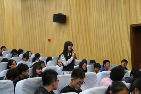 随后进入到学生党员先锋交流环节,他们将自己进入大学以来的学业规划以及截至目前的学习心得,向在座的新生们娓娓道来。其中,今年国家奖学金得主、2012级的罗婷婷同学以亲身经历,提醒各位新生做学业规划时必须深思熟虑。关于有考研、保研意向的同学们,罗婷婷与何青青同学均强调了科研能力的重要性,鼓励学弟学妹可以努力在本科尝试基础的科研训练。何青青同学更为新生提供了能够锻炼科研能力的具体方法,使大家受益匪浅。而对于以出国深造为目标的同学们,邱淑杰同学建议其能尽早着手准备,同时也鼓励各位新生出国挑战优秀学府,向高目标发起冲刺。