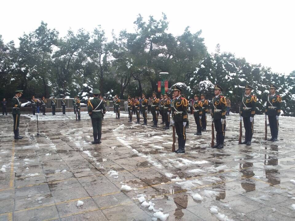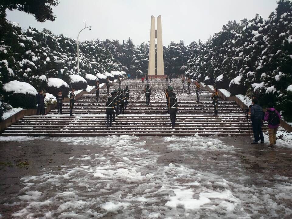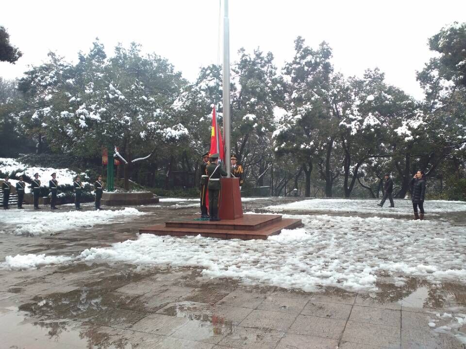 位于杭州市西湖风景区内的云居山上的浙江革命烈士纪念馆,是杭州市十大爱国主义教育基地之一。纪念馆旁的革命烈士纪念碑高27米,碑身系汉白玉贴面,呈风帆形状,碑上题写着“革命烈士永垂不朽”8个大字。在雄壮的国歌声中,五星红旗徐徐升起,迎风飘扬,在皑皑大雪中更显鲜艳。升旗仪式结束后,国旗护卫队向革命烈士纪念碑敬献了花圈,并作了以爱国主义教育为主题的演讲,深切缅怀了烈士们浴血奋战、为全国人民的解放和发展舍生取义的牺牲精神和无私奉献精神。