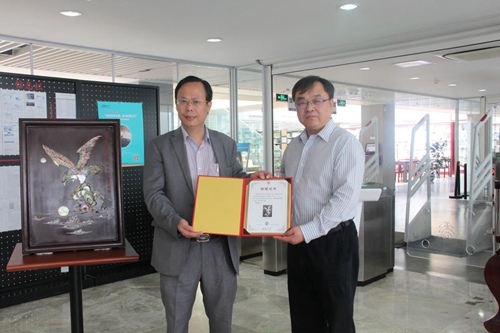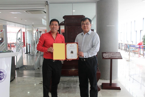 之后,潘剑锋书记向浙江校友代表郑翔洲嘉州商界传媒董事长、海南校友代表朱绵茂颁发《捐赠证书》。