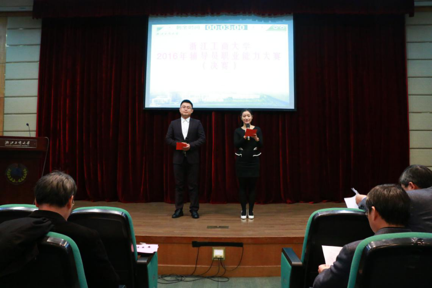 为进一步推动我校辅导员职业化、专业化发展,提升辅导员的专业技能和职业素养,12月21日上午,校2016年辅导员职业能力大赛(决赛)在下沙校区举行。省教育厅下沙高教园区管委会办公室主任胡惠华,校党委副书记任志国,组织部、宣传部、学生处、研工部、团委、心理健康教育中心等职能部门负责人出席并担任评委,本次比赛还特别邀请了浙江工业大学、杭州电子科技大学、浙江科技学院等兄弟院校学工部长和两名学生担任评委。各学院分管学生工作负责人、全体辅导员参加观摩了本次比赛。