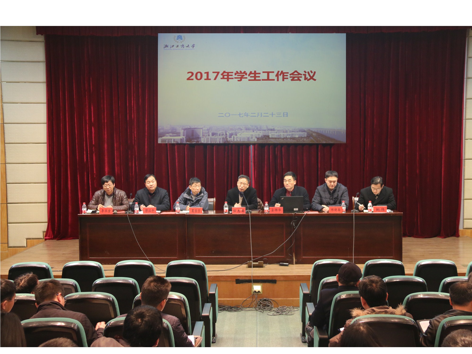 2月23日下午,我校在下沙校区图书馆一楼报告厅召开2017年度全校学生工作会议,校党委副书记任志国主持会议并讲话,学工部、研工部、教务处、保卫处、团委、后勤服务中心等部门负责人和各学院分管学生工作负责人、全体辅导员参加了会议。