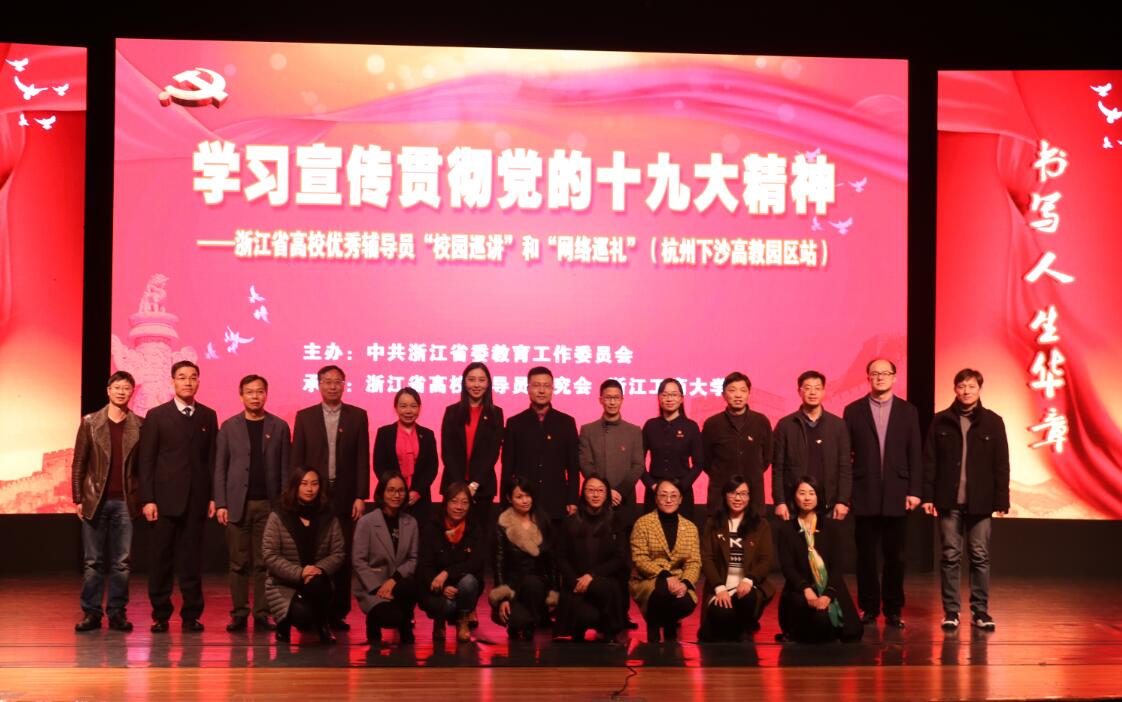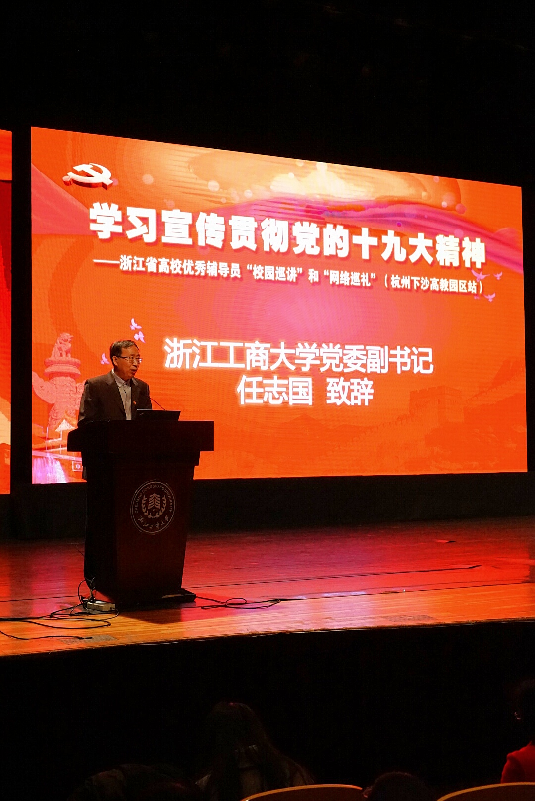 为进一步推进党的十九大精神学习宣传全覆盖,引导广大青年学生自觉用习近平新时代中国特色社会主义思想武装头脑,不忘成长初心,牢记时代使命,12月11日下午,由中共浙江省委教育工作委员会主办的学习宣传贯彻党的十九大精神——浙江省高校优秀辅导员“校园巡讲”活动(杭州下沙高教园区站)在浙江工商大学下沙校区学生活动中心剧院举行。浙江省教育厅宣传教育处处长薛晓飞、浙江省教育厅下沙高教园区管委会办公室主任胡惠华、下沙高教园区14所高校党委学工部长出席活动;浙江工商大学党委副书记任志国致辞;来自下沙高教园区14所高校的800多名辅导员与学生代表参加巡讲会,学习领会十九大的丰富精神内涵。活动由浙江工商大学党委学工部部长金锦华主持。