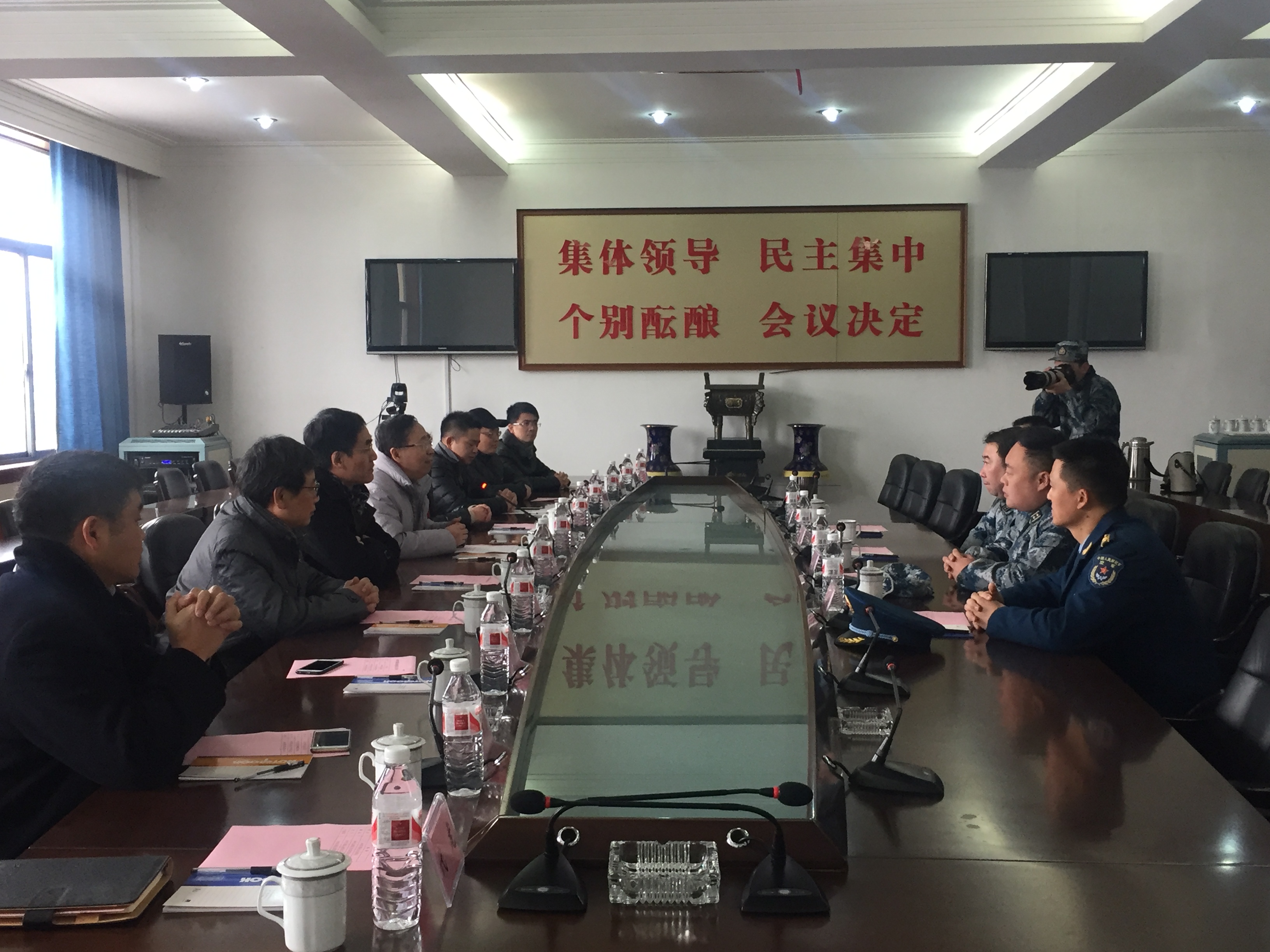 在驻杭空军某部会议室,校领导与部队首长进行了座谈。任志国副书记介绍了学校深化综合改革成果和推进高水平大学建设情况,代表我校师生向部队官兵致以新春的祝福和美好的祝愿,衷心感谢部队对我校2017年新生军训工作的高度重视和支持,希望部队官兵一如既往继续支持我校新生军训、国防文化建设和爱国主义教育等工作,深入持久开展军地共建活动。