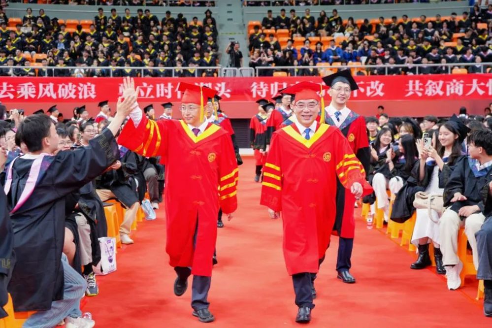 王永贵向毕业生送上美好的祝福,并作题为《与时代共舞 创新向未来:以青春卓越之名续写人工智能时代的幸福答卷》的暖心演讲。他表示,在人工智能重塑世界的今天,青年人要以赤子之心把握时代脉搏,成为拥抱和追求人工智能时代的中坚力量。他鼓励大家用创新思维开创未来,以勇立潮头的胆识、突破桎梏的魄力、担当重任的情怀和超越自我的志气,勇敢拥抱人工智能时代的机遇与挑战。他特别叮嘱毕业生们,要牢记在商大积累的知识财富、磨砺的坚韧品格和培育的团队精神,让这些宝贵财富成为人生路上的坚实依靠。最后,他将母校的祝福化作温暖寄语:愿这份情谊成为你们翻山越岭的支撑,渡江涉险的助力。衷心祝愿所有毕业生前程似锦,在人生新篇章中书写属于自己的精彩故事。
