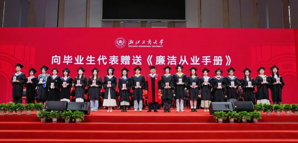 校纪委书记胡金生向毕业生代表赠送《廉洁从业手册》,希望毕业生们以清正风姿立于世间,以廉洁之心为人处世。