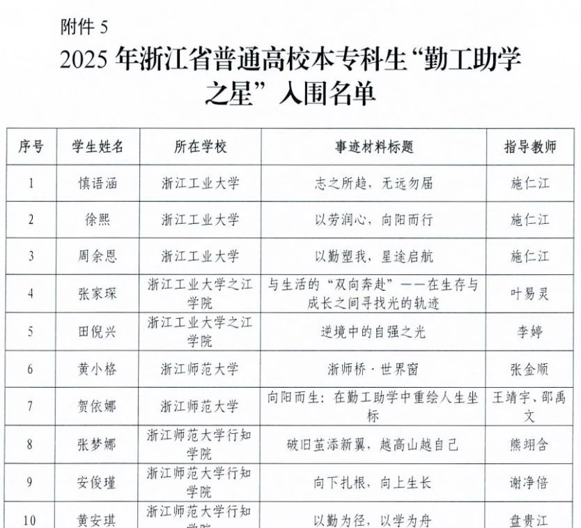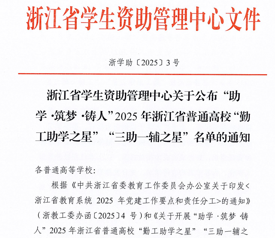 为倡导和激励学生自立自强、努力成才,表彰在勤工助学活动中表现优秀、成绩突出的先进典型,充分发挥勤工助学在“资助育人”中的积极作用,我校于2025年5月启动浙江工商大学第九届勤工助学之星评选活动,经专家评审评选向省资助中心推荐我校多名同学参评“助学·筑梦·铸人”2025年浙江省普通高校“勤工助学之星”活动。