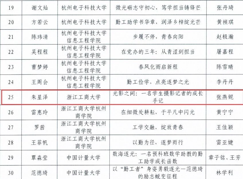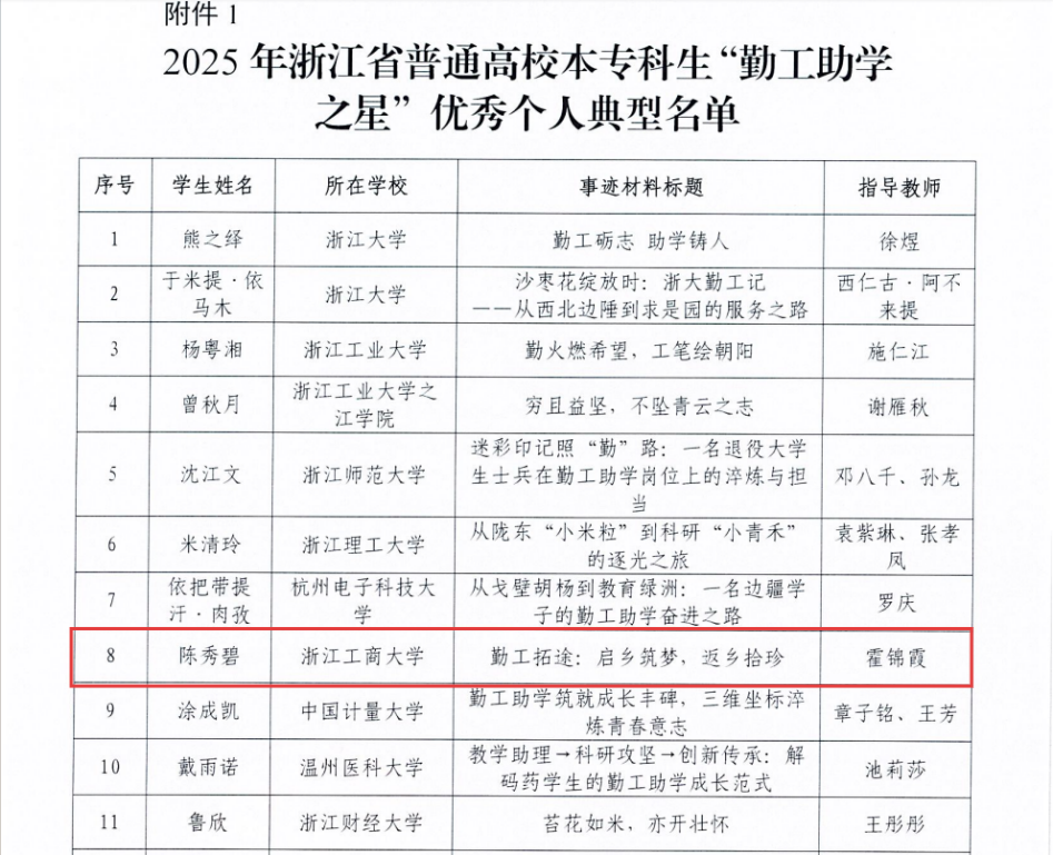 近日,浙江省学生资助管理中心公布了“助学·筑梦·铸人”2025年浙江省普通高校“勤工助学之星”“三助一辅之星”名单。我校旅游与城乡规划学院陈秀碧荣获“勤工助学之星”优秀个人典型;法学院(知识产权学院)冯玥、人文与传播学院朱玉香荣获“勤工助学之星”推荐学习个人;统计与数学学院朱星泽入围“勤工助学之星”名单。