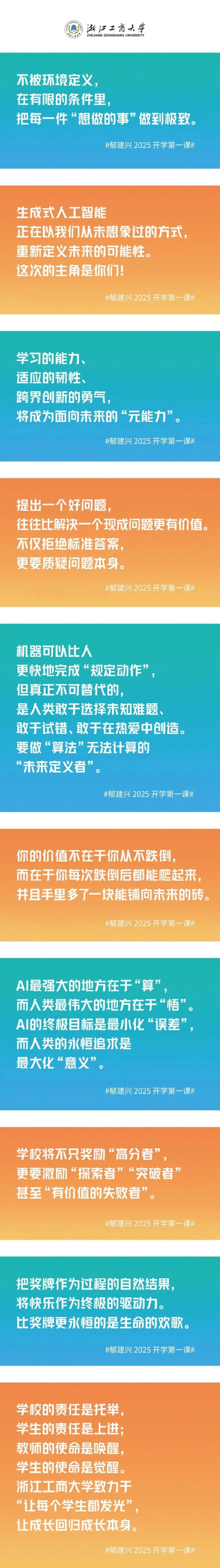 郁建兴说,大学生活中的“意外”是“无限游戏的转折点”,而非“计划的破坏者”,要聚焦自身特质、规避盲目模仿、重新定义成功,努力做不惧失败、战胜恐惧的创新型人才,比奖牌更永恒的是生命的欢歌。
