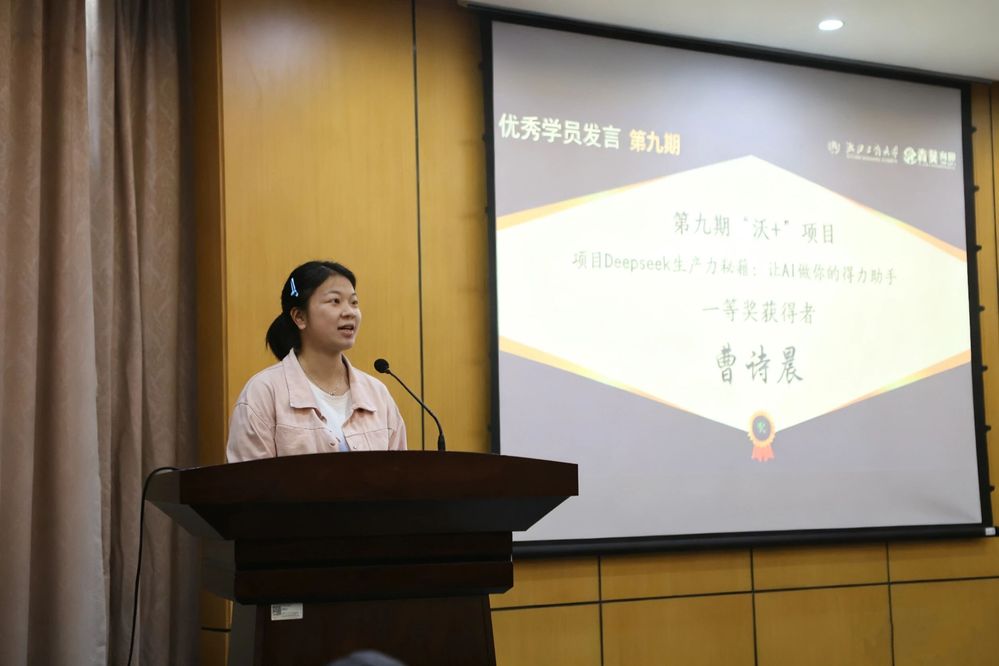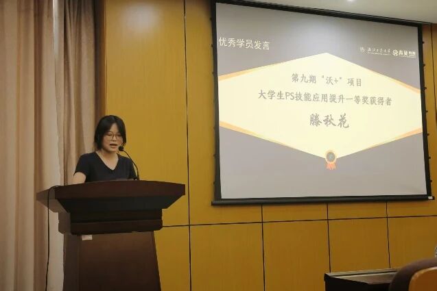 本次仪式邀请第九期“沃+”项目优秀学员——Deepseek生产力秘籍:让AI做你的得力助手一等奖获得者曹诗晨、大学生PS技能应用提升一等奖获得者滕秋花作经验分享。曹诗晨同学表示,通过“沃+”项目学习她不再畏惧代码,而是借助deepseek的力量创造自己的智能体,实现对代码的举一反三,并持续消灭错题。滕秋花同学表示在老师的细心指导下她能够熟练使用PS,并在一次次动手实践中真正做到“学以致用”,同时在“沃+”课堂中还结识了许多来自不同专业的同学。在“沃+”学生素质能力提升项目中,两位优秀学员都走进技能的世界,不断挖掘智用科技的潜力,成为了自己生活中的“创造者”。