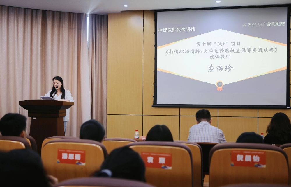 在本次仪式上,应浩珍老师作为第十期“沃+”授课教师代表发言。应老师将“沃”视作三重成长赋能:是Welfare,即依托资助、校友的零门槛技能平台;是Work,瞄准校园到职场的实战预备;更是We,代表小班互助的社群共生。“+”则是四维价值延伸:+专业深度、+资源链接、+同伴力量,更+长远发展的底气。因此,“沃+”是“以沃为基赋能,以+为翼成长”,让短期学习变长期受益,个体成长融社群价值。应老师带着丰富的专业积累,聚焦“劳动权益”,用生动的实战场景,帮大家提前准备好“职场盾牌”。最后,她希望每一位同学都能在“沃+”课堂里收获可落地的实用技能,找到面向未来的成长底气,祝愿新一期“沃+”顺利开展,期待大家在这片沃土上耕有所获、创有所成,成为更好的自己!