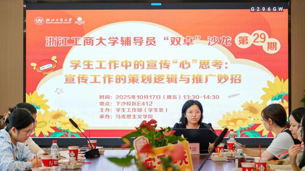 为进一步推进宣传效能,提升辅导员宣传育人能力,10月17日,浙江工商大学第29期辅导员“双卓”沙龙在下沙校区马克思主义学院E412会议室举行。本次活动特邀浙江理工大学机械工程学院学工办主任、团委书记巴楚洁主讲,全校40余名辅导员参会交流,由学工部副部长鲍碧丽老师主持。