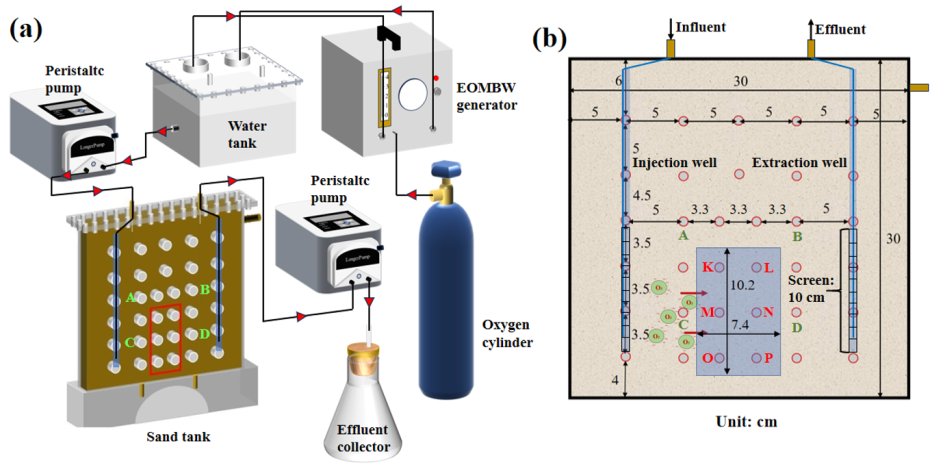 她和团队小伙伴们想出了一套“组合拳”——给气泡穿“保护衣”。首先,她们制造了一种含有无数“清洁泡泡”的溶液,通过这些非常微小的泡泡携带强效的氧化剂“臭氧”,并且在外面包裹了一层天然的生物表面活性剂,让它们更稳定、更容易在土壤缝隙中移动;然后,她们一边注入这种“清洁泡泡水”,另一边同时抽水,引导和控制地下水的流动,就像为“清洁小队”修了一条“高速公路”,帮助它们更有效地抵达并清除那些藏在隐秘角落的污染物。