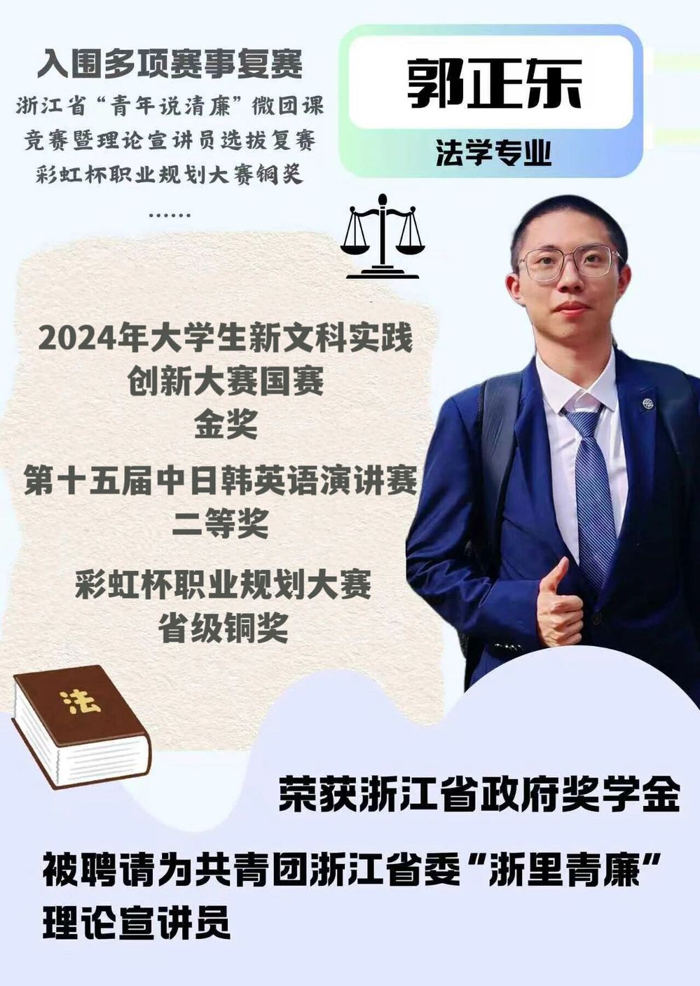 他的志愿之路,与城市发展同频共振。当“环保绿”成为杭州底色,他勇当“小河长”,带领伙伴们数次科考新塘河,撰写调研报告获创新奖项;他发放自制节能卡片、彩绘钱塘江堤坝,用画笔和行动呼吁保护母亲河,相关作品屡获大奖并见诸报端。当“垃圾分类”新时尚兴起,他组织无痕行动,走进社区宣讲,甚至创新制作语音识别机器人“LALA”助力推广,荣获创客大赛奖项。当“世界蓝”盛会接连登场,他从G20的文明劝导员,到亚运会、数贸会的核心志愿者,始终以最饱满的热情、最专业的服务,向世界展示杭州青年的自信与友善。他还化身文化传播者,在西湖、博物馆、纪念馆为中外游客讲解杭州历史,在图书馆、社区分享志愿心得与红色文化。他的志愿服务,已从简单的爱心付出,升华为参与社会治理、传播城市文明、促进国际交流的青春力量!