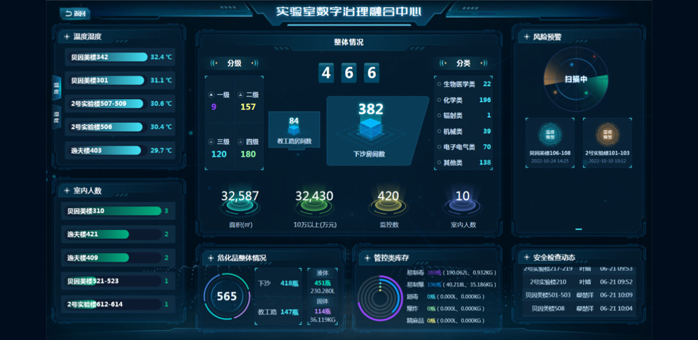 积极探索实验室安全全域数字治理新形态,通过基于数据与算法双驱动的治理模式,形成“用数据创新、用数据决策、用数据说话、用数据管理”的实验室安全IDSM治理新机制。数据融合中心日均数据产生18400余条,为实验室治理主体形成精准的数字画像提供数据血缘。“实验室安全全域数治融合应用”入选教育部产学合作协同育人项目、浙江省教育领域数字化改革创新试点项目。
