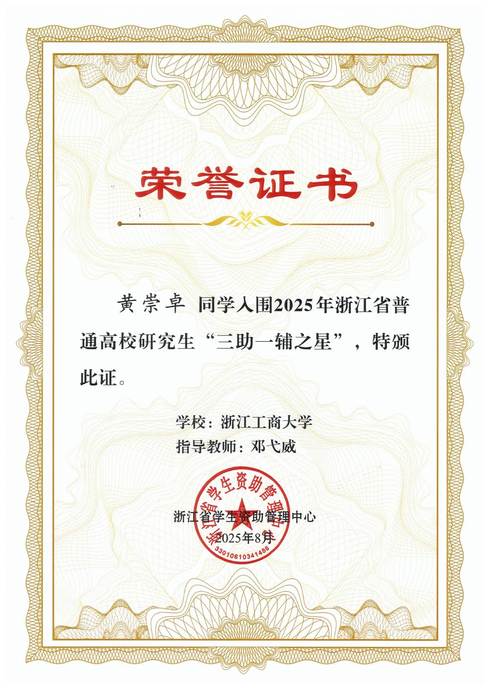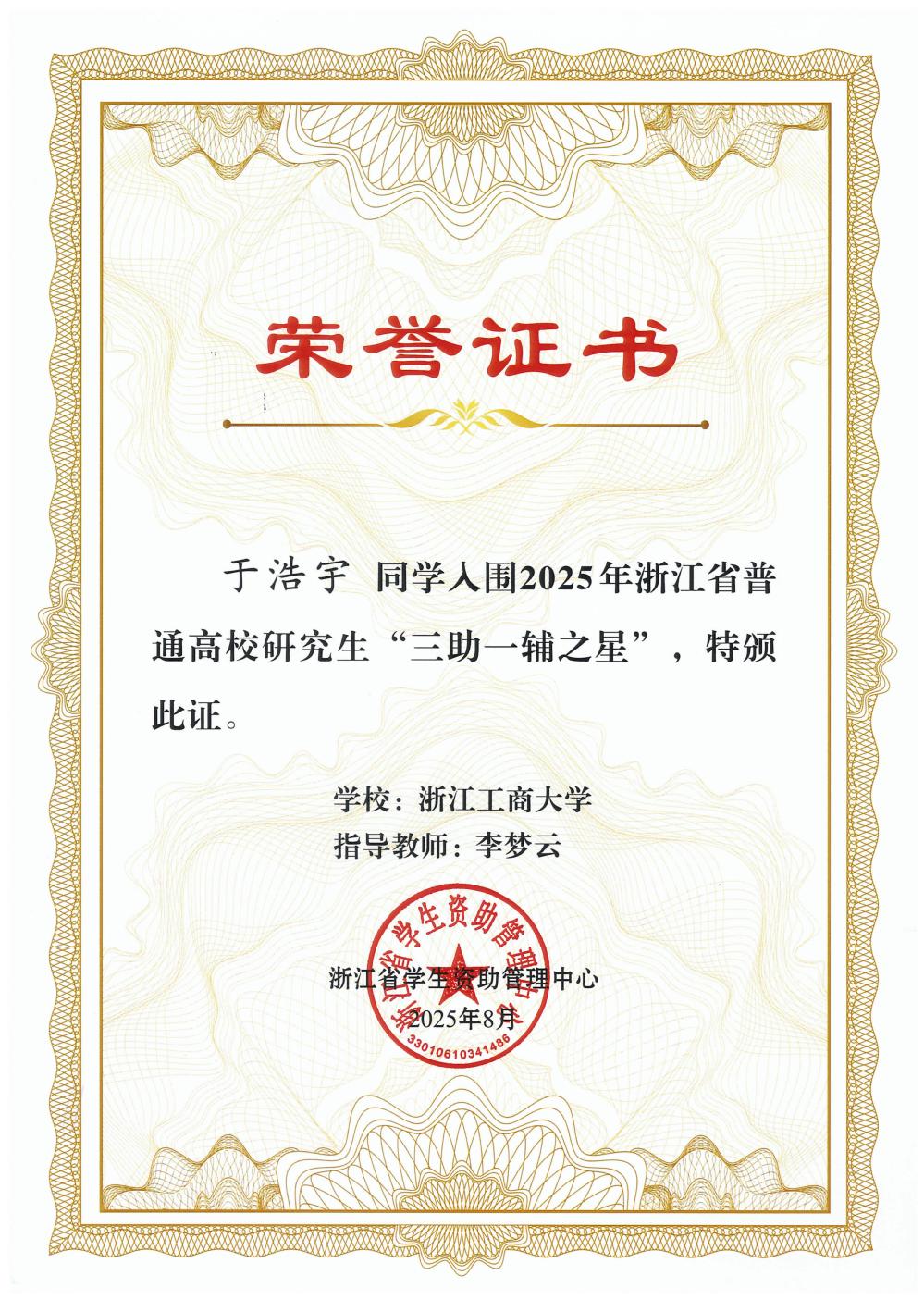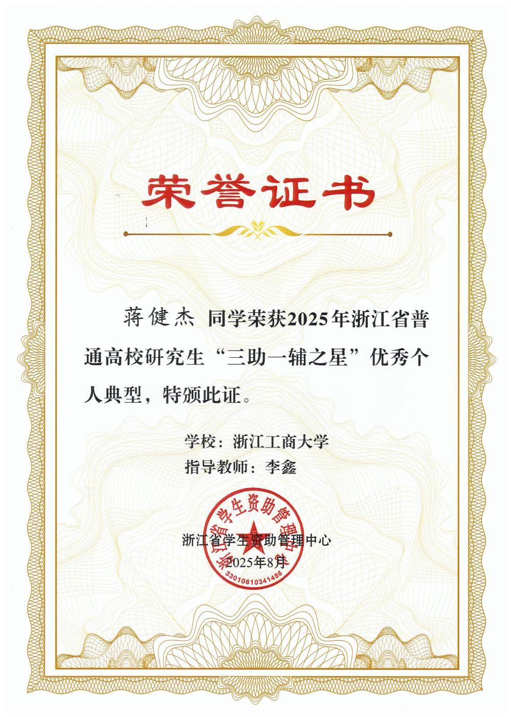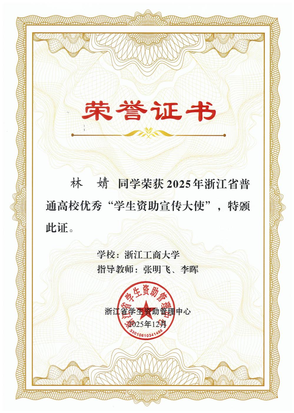 深入开展研究生“三助一辅之星”评选和“学生资助宣传大使”选树活动,2025年学校1人获评浙江省研究生“三助一辅之星”优秀个人典型(全省仅 10 人),3人入围浙江省研究生“三助一辅之星”名单,2人获评浙江省优秀“学生资助宣传大使”,实现学校在省级层面研究生资助育人奖项的全覆盖。
