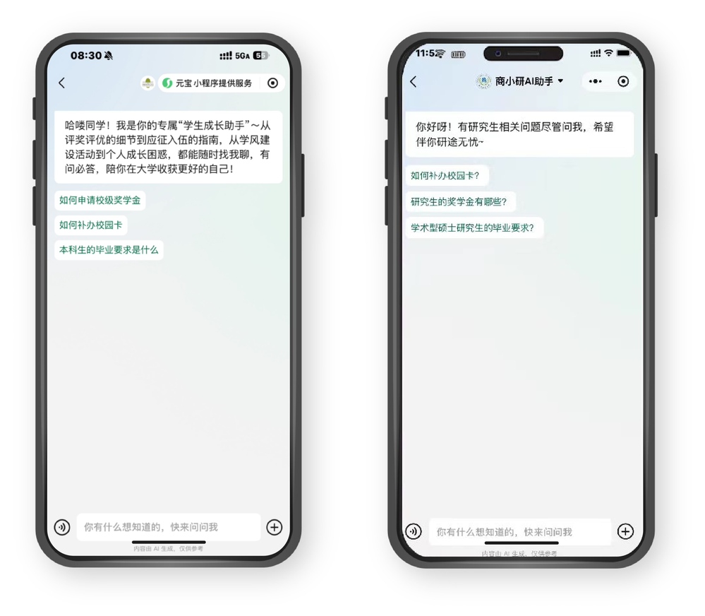 同时,“梦飞飞成长助手”“商小研AI助手”筹备上线。依托学校本科生、研究生专属知识库,深度融合DeepSeek大语言模型强大的推理能力与高效的检索能力,提供涵盖学业、科研、生活全场景无缝衔接的一站式服务,全年无休的7×24小时秒级响应,这种“随时问、即时答”的服务模式,能帮学生第一时间解决疑问,避免因等待延误科研进度或事务办理,希望让研途的每一个需求能被及时回应。