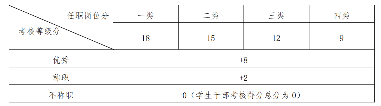 按年度记录、考核学生干部在本年度的任职工作情况,考核分优秀、称职、不称职三个等级(考核等级栏需注明实际考核等级,任期满半年但未达一年的学生干部的任职岗位分与绩效考核分均需减半)。优秀名额原则上不超过参与考核人数的30%。