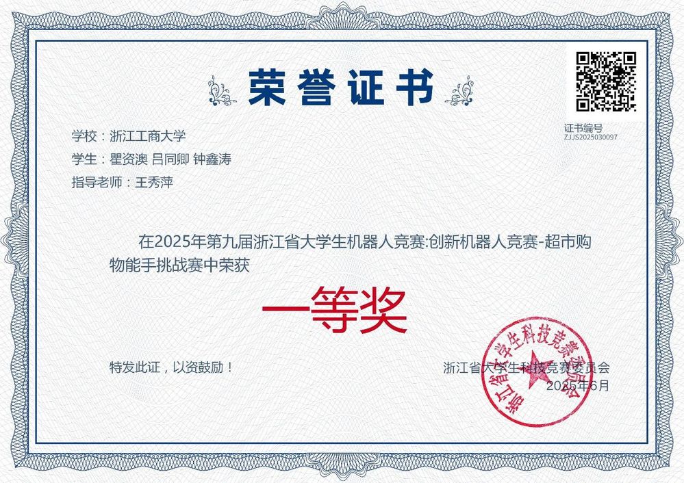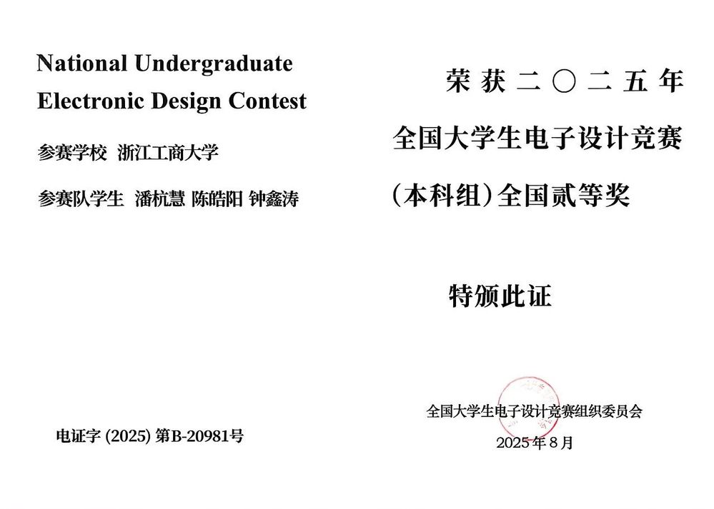 当被问及大学四年里最有成就感的一次经历,钟鑫涛毫不犹豫地想到2025年上半年参加的浙江省机器人竞赛。在这场全省有80支参赛队伍的激烈比拼中,钟鑫涛和成员们从方案讨论到落地调试,几乎每天都泡在实验室,虽然他们的硬件配置相对简单,使用的是总线舵机搭起来的机械臂,没有太多“硬件优势”,但是凭借着一丝不苟的态度和通宵达旦的努力,最终以稳定的表现拿下了第一名,用有限资源拼出最好结果。钟鑫涛认为这次成功的关键,首先是成员之间的默契配合,他们分工明确,遇到分歧时能及时沟通协商;其次是解决问题的能力,面对技术瓶颈时,他们主动找往年的学长请教,也善于利用网上资源,通过上网查文献、找技术论坛寻求解决方案,用“已有知识+外部经验”的组合解决问题。钟鑫涛认为这次经历给予他的收获远超一张奖状:一是让他学会了在资源有限时做尽可能的优化;二是高效的团队配合能让结果1+1>2,而主动向他人学习、善用外部资源,更是解决复杂问题的高效方式;三是锤炼了他的抗压能力,通宵调试的疲惫、比赛前的紧张,都让他学会在高压下保持冷静。