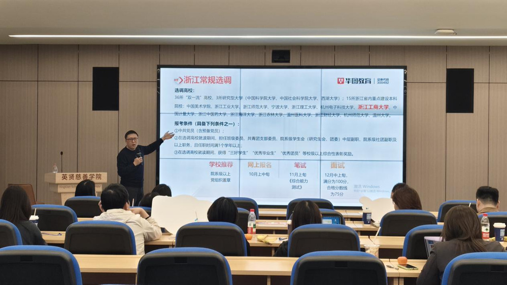 李铭老师则聚焦考公考编就业指导带来干货分享。他结合最新数据指出,当前毕业生就业压力凸显,考公考编凭借稳定性、公平性成为重要选择。他详细解读浙江应届生的报考政策,将考编划分为四大梯队,同时梳理了浙江全年考编时间轴,讲解行测、申论核心备考要点。备考方面,李老师建议引导学生至少提前6个月规划,行测申论按6:4分配学习时间,遵循“入门筑基、强化刷题、模拟自测、考前冲刺”四个阶段备考,牢牢抓住应届生身份的黄金备考期。