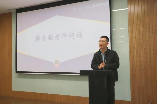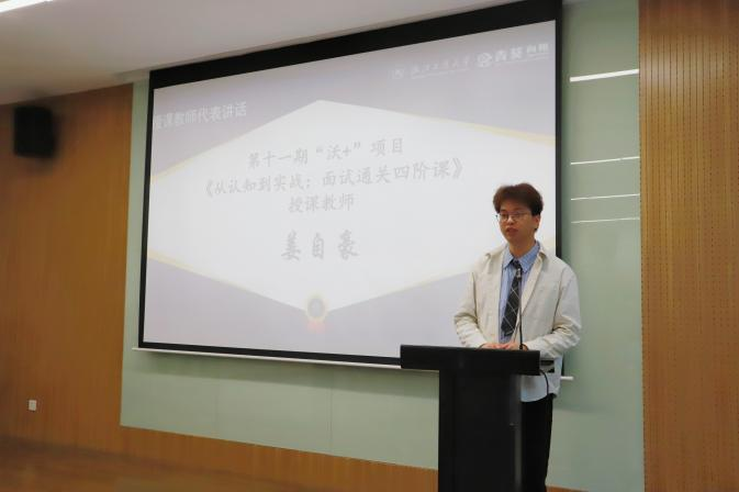 在本次仪式上,姜自豪老师作为第十一期“沃+”授课教师代表发言。姜老师认为“沃+”的“沃”,是Welfare的温暖支持,是Work的职场衔接,是We的同伴同行;而“+”,是加技能、加资源、加底气、加未来。在沃+,短期的学习能变成长期的竞争力,个体的努力能融入共同成长的力量。最后,他希望每一位同学都能在“沃+”课堂里收获可落地的实用技能,找到面向未来的成长底气,期待大家在这片沃土上耕有所获、创有所成,成为更好的自己。
