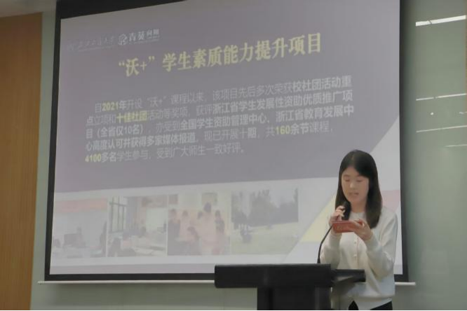“沃+”学生素养能力提升项目,是利用第二课堂开设的多类型实用技能培训课程。依托校友力量,产教融合,建设实践发展基地,帮助学生提升职业素养和就业竞争力,通过“小班化精课堂”,为学生提供一个社群化交流平台,拓宽同学们知识的广度,从而推动学生的高质量发展。自2021年开展以来,该项目已实施十学期,开展160余节课程,参与人数多达4100余人。此项目也已获得2024年浙江省学生发展性资助优质推广项目,且连续两次获得浙江工商大学十佳社团活动荣誉称号,受到广大师生一致好评,同时项目也受到了全国学生资助管理中心、省教育发展中心的高度认可,获得多家媒体的报道。